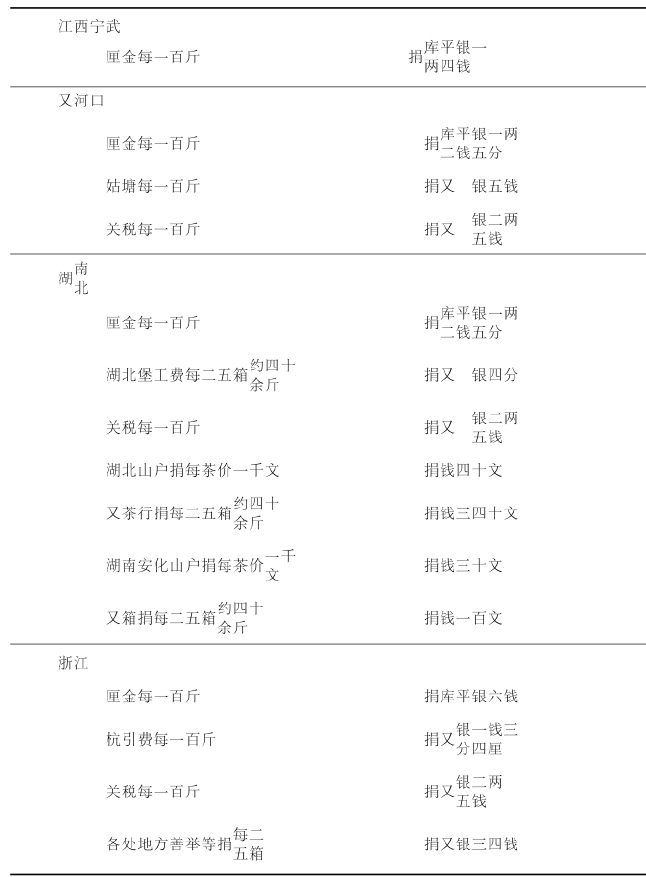 为恢复中国茶叶市场占有率,有人提出仿照印度的制造方法生产茶叶,但也有人认为是中国茶叶的课税妨碍了中国茶叶的出口。在内地课税上,每个省的厘金额都有所不同。具体每个省的独立课税项目设定如下所示: