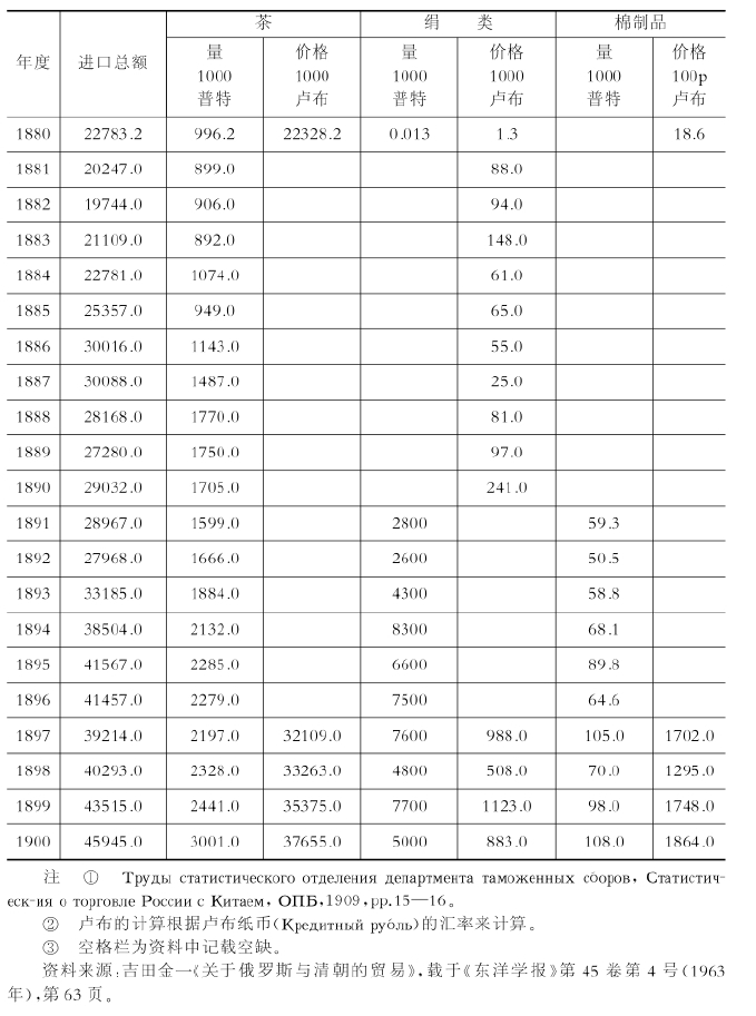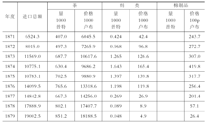 值得注意的是,福州的茶叶出口渐趋衰退,取而代之的是汉口向蒙古、俄罗斯茶叶出口的激增。正如表4-11所示,从19世纪70年代开始,向俄罗斯的茶叶出口开始激增,它与中国向英国、美国的茶叶出口减少形成互补的关系。这种现象说明,中国的茶叶出口与国内消费并存,并非专门为了出口而进行生产。同时,这也意味着,从南京条约签订、开放五个港口城市以来,中国在茶叶出口,进而在对外贸易关系上,从关注华南沿海的对外贸易转变为华中及扬子江贸易也开始占有一定的分量。而且,伴随着俄罗斯向亚洲的贸易进展,经由蒙古、俄罗斯的贸易重要性也开始增强。此前俄罗斯与清朝政府之间的贸易关系,直到18世纪中叶为止一直是俄罗斯的毛皮出超状态,从18世纪后半期开始,中国茶叶的出口开始增加。俄罗斯原来把经由卡夫塔的英国棉布作为与中国茶叶交换的等价物,但中国开始从新开放的五个港口进口棉布之后,俄罗斯在1854年解除了白银出口的禁令,这就为与中国的贸易提供了更加有利的条件。
