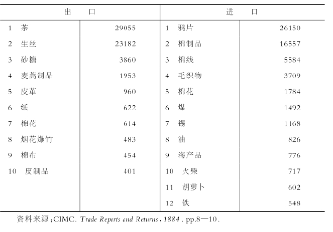 表4-1 中国主要进出口产品(1884年)(单位:1000海关两)