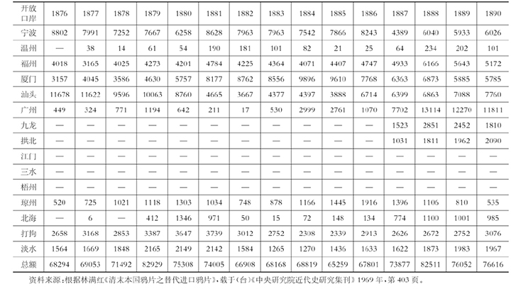 从中国方面官方统计数字也可以看到,对当时国产鸦片产量的增加有着充分的认识。基于19世纪80年代的海关报告,也有如下分析: