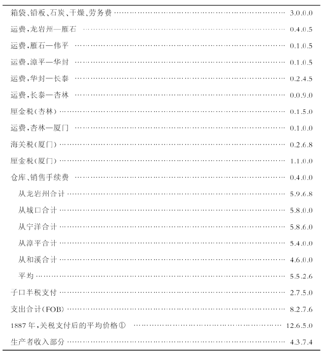 在上述各目之外,还包括运费、包装费、仓库费、买卖手续费等其他费用。1担茶叶从龙岩州运送到厦门的费用如下所列: