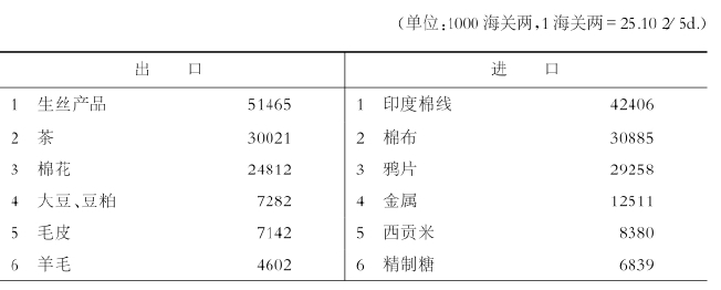 中国的对外贸易是以欧美诸国也参与其中的亚洲区域内贸易为中心而构成的。这一点,可以通过参阅表4-1和表4-2的贸易中的商品构成看出来。表4-1和表4-2分别表示1884年和1904年的海关贸易统计数据。这些商品构成及其数量多少的顺序,显示出与19世纪60年代开始就基本相同的倾向,其变化不过是数量上的扩大。从这些商品类别顺序表也可以看出,直到20世纪初,欧美的工业产品在中国的主要进口产品中也没有占据主要地位这个一直被关心的问题。然而,这些商品构成的整体情况表明,出口仍然以生丝和茶叶等特产为中心,而在进口方面却以印度棉线、印度鸦片为中心,还包括亚洲其他地区生产的大米等产品,它显示出以东南亚为中介的多边贸易的存在。