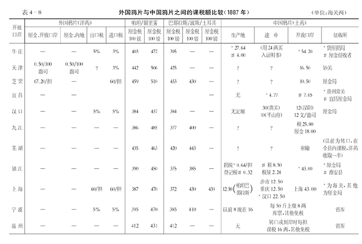 海关注意到,在中国内地的课税对于外国商品和国产商品有很大的不同,从其课税的情况来看,这对后者不是更有利吗?表4-8是对各通商口岸调查后的外国鸦片和中国鸦片的课税额一览表。