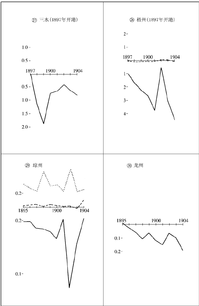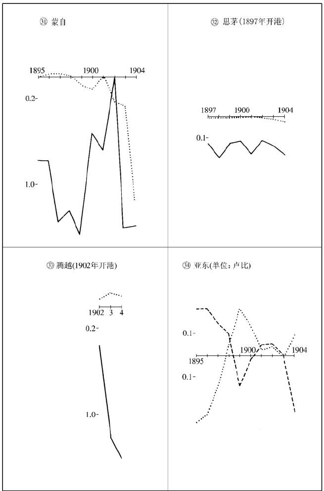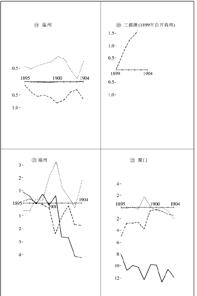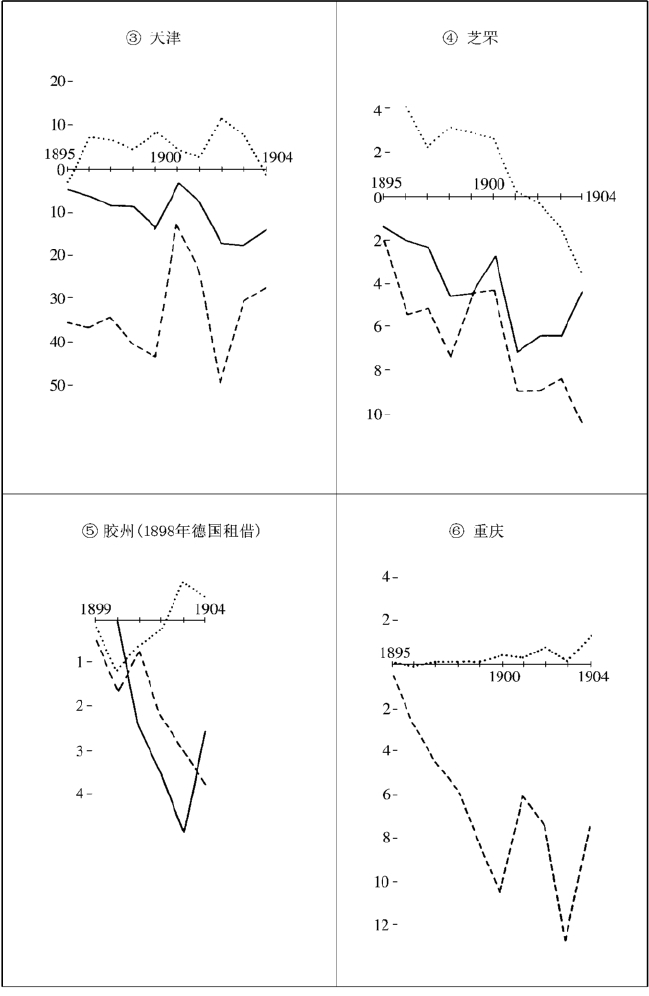 (5)转口税(transit dues)较高的通商口岸有天津、岳州、镇江、梧州、龙州、思茅、腾越等地。转口税的主旨是以把货物运送到内地为前提而收取的。如果与这点相对照来考察,可见这些通商口岸是通过与后方市场保持密切联系来从事出口或进口贸易的。
