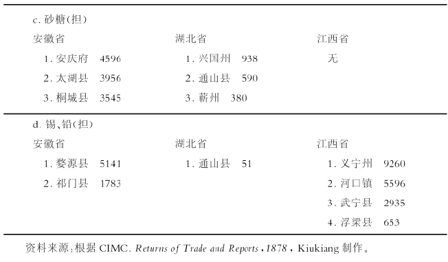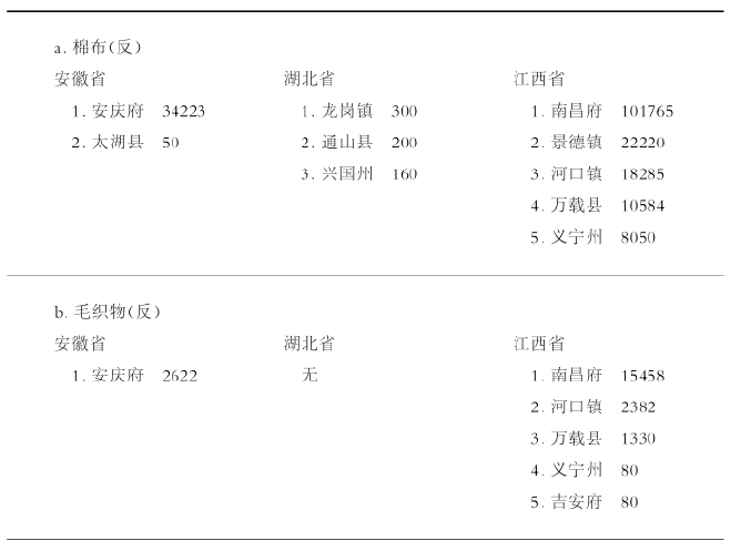 通过表4-27可知,安庆府进口了大量的棉布和砂糖,但其改变了主要的进口对象,不是从镇江,而是从九江进口。从镇江的进口因此而有所减少。