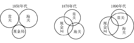 让我们分别来看海关、常关、厘金局这三个层次的税关情况。本来海关负责外国贸易,常关负责国内民船贸易,厘金局是负责管理地方贸易的机构。但是,在具体的运作过程中,海关通过转口税、子口半税的税则开始逐渐将业务范围扩大到内陆以及内地市场。而与此相对应,各地方的反应也很强烈,展开了为确保地方财源的厘金维持活动。如果把因转口税则而变迁的海关、常关、厘金局三者的相互关系,按照时代顺序制作成概念图的话,如图4-1所示。
