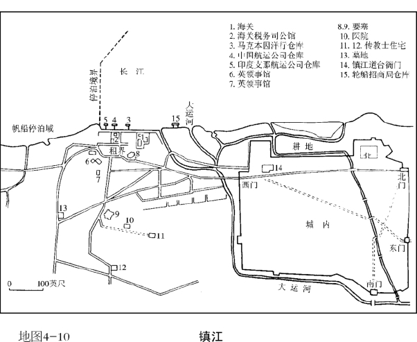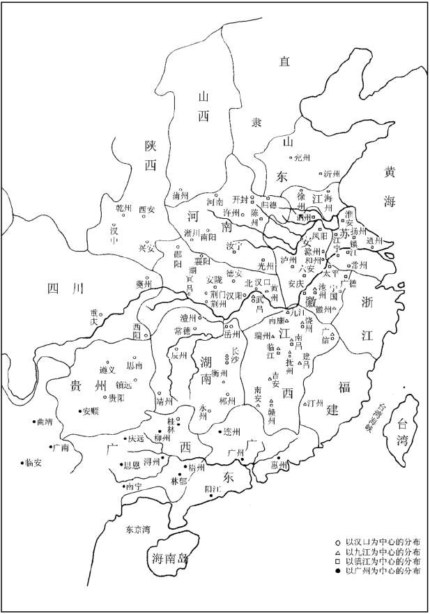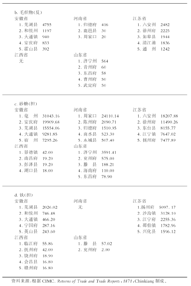 (3)从华中的常关所在地和厘金总局的所在地来推断,每个省份主要的商品集散地有3-6个,在它之后、位于第二级位置的地点则是其数量的2-3倍。从镇江分配来看这一点,它们是安徽的大通、和悦,河南的鹿邑,江苏的江宁以及山东的济南等地。