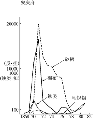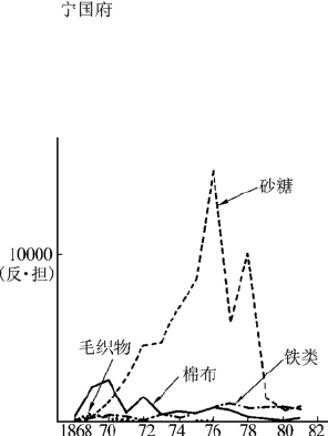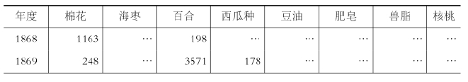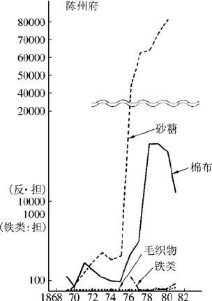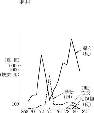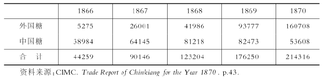 作为单一商品,砂糖的进入量最大,其中又以中国产砂糖占绝大多数。但是,几年后外国商品竟完全占据了优势地位。正如表4-25表明的那样,以1869年为转折点,外国产糖完全压过了中国。