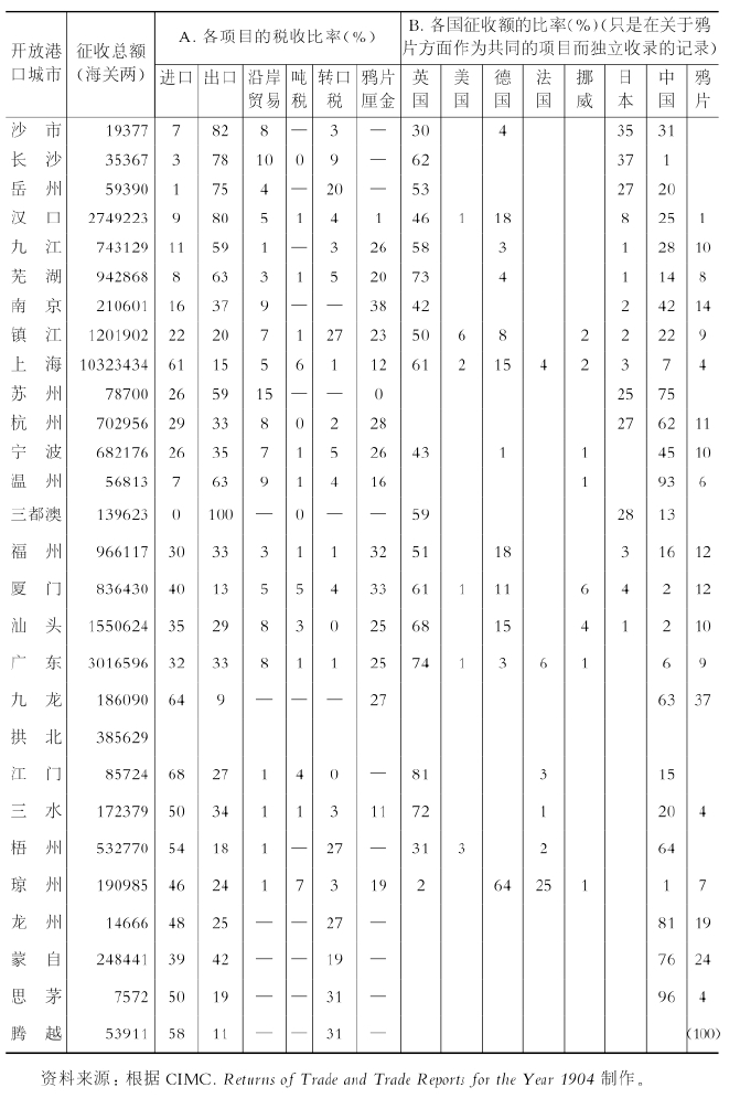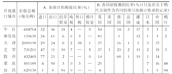 正如此表所示,根据商品的不同,进出口税也有所不同。具体为鸦片7.5%,棉制品3.81%,毛织品6.04%,金属5.68%,茶叶10.87%,生丝2.39%。除棉制品和生丝这两种在当时进出口中占第二位的商品之外,其他商品的课税额全部超过了5%。不仅如此,如果再加上在内陆贸易中的课税,课税额占第一位的金属为20%,超过了其他所有商品。因这种课税率比海关的课税率还要高,可以认作关税征收过多的例证。但是,即使对于出口贸易,这种课税也不是保护关税,而是作为财政关税而征收的,所以从这种课税政策上来看,税额的多少也是相对的。