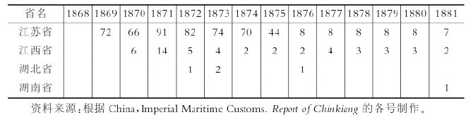 具体分析1868-1881年间经由镇江进入的商品结构,包括经外国商人手的棉布、毛织品、铁等商品以及以外国商品名义运送进来的例如砂糖等商品,把商品运送目的地以省份来综合统计的话,可知安徽省为49、山东省为27、江西省为8、河南省为18、江苏省为57个地方。