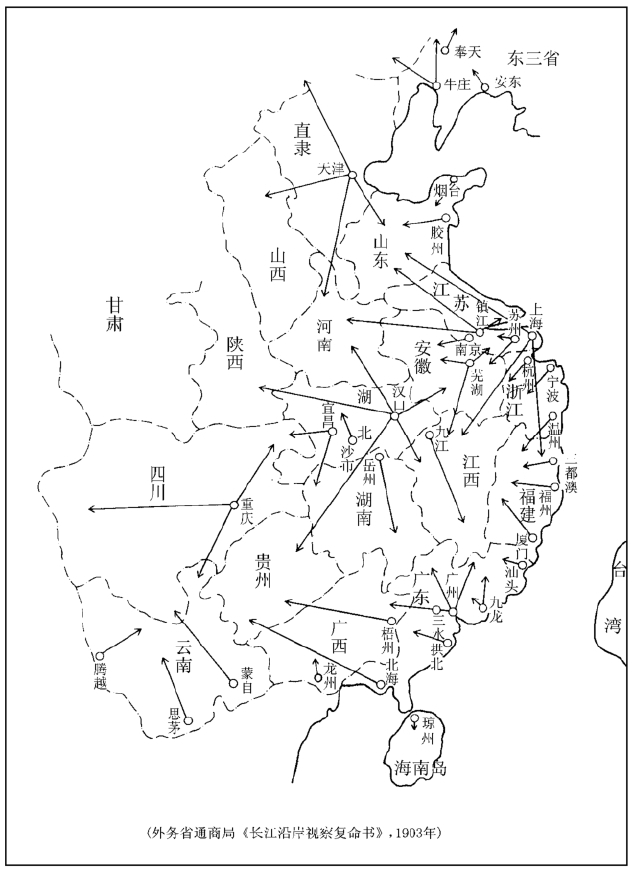 据图可知,由上述四个港口送出商品所到达的地域,尽管包含了一部分重复的城市,但它们各自分担地区的覆盖面却涵盖了华南大部分地区,甚至还经大运河北上至华北的山东省。如果从另一角度观察这一地理范围的话,可以发现,从沿岸通商口岸到华南中央地带的经路,从地理上来讲并不多,所以沿岸通商口岸在沿海贸易中占有更大比重,尽管距离很远,但商品分布从扬子江沿岸的通商口岸开始直至华南一带,可以说,这一点是其特征所在。