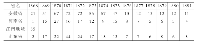 表4-23 各省份从镇江海关运入商品的地区数量(1868-1881年)