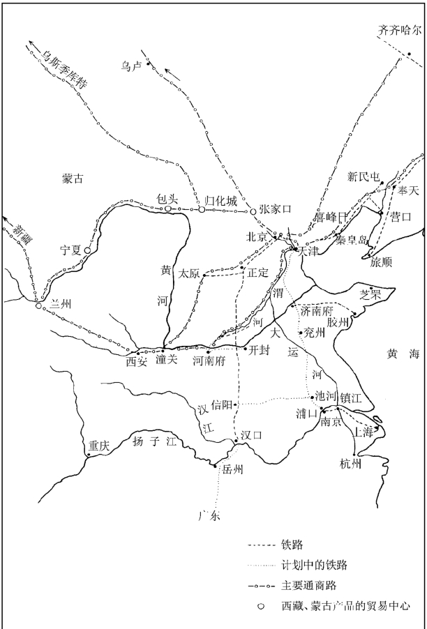 据上表所示,1902年8-11月这3个月间,从天津运送到内地市场与从内地运送到天津港的商品比例为30:70.将这两者综合起来,可知大约31%经由西河运送,经由铁路运送的占24%,位居第二。占第三位的是经由大运河运送的,大约占19%。这不仅说明由于通商口岸与铁道的连接使港口城市能够进一步与广泛的内地市场相连接,而且还意味着仅仅通商口岸之间的贸易是不能反映内地市场动向的。当然,伴随着纵贯内陆的铁道建设的兴旺发展,我们必须通过交通手段的变化之间的关系,来理解通商口岸贸易以及通商口岸与内地市场之间的关系(请参照地图4-5)。