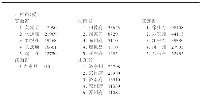 (2)图表显示从这一期间的初期开始,扬州与淮安就开始进口,而山东济宁与河南的陈州等地则从这一期间的后半期才开始进口。这大概就是进口商品逐渐向外缘渗透的结果。至于济宁以棉布为主,陈州以砂糖为主的情况,也是消费地特征的反映。