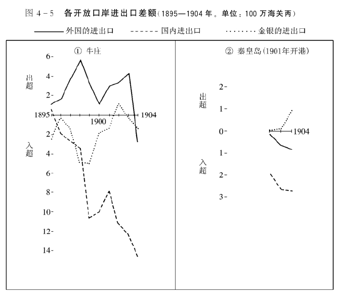 南北沿海贸易是以北方的大豆、豆饼与南方的砂糖、大米为中心进行的。然而,这种贸易由于转口税则的引入以及大豆向外国出口的解禁而被纳入到了外国贸易的范畴。而东西扬子江贸易是以江苏、浙江等位于东岸各省所生产的手工业制品和位于扬子江西面的四川所生产的农产品、鸦片为中心进行的。由于扬子江税则的引入,东西扬子江贸易同样被纳入外国贸易的范畴。然而,从税则或税收的方面来看,这种动向也带来了如下作用:使得上海的地位得到强化,并且使其作为大型转口地、集散地的作用更加增强;但同时,也使沿岸的帆船贸易和常关、厘金局等归属地方管辖的领域之间产生了新的摩擦与矛盾。