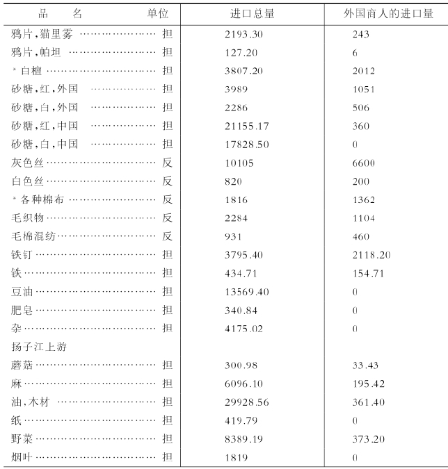 以食品、服装为代表的日用品中,包括外国产鸦片,主要都是经中国商人手进口的。其中白檀、灰色丝、各种棉布以及铁钉等商品是由外国商人进口的。在棉布方面,这一时期进口到中国内地的并非棉线,而是成品的外国棉布,外国棉线还没有出现。