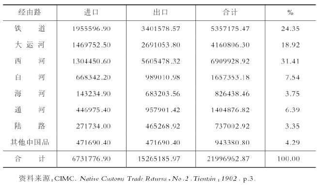 以海关为窗口收集到的与通商口岸有关的贸易状况记录,只能反映截至20世纪初期的通商口岸市场圈情况。之所以这样说,是因为由于铁路的建设,使得南北之间的内陆运输得到强化,致使无需经由通商口岸的内陆市场的出现。铁道真正开始投入建设的时期是20世纪10年代之后,这一时期也正是通商口岸市场圈与内陆市场圈并存、同时相互影响产生新关系的时期。下文以天津为例,分析从开放港口市场到内陆市场的货物运送的方法。