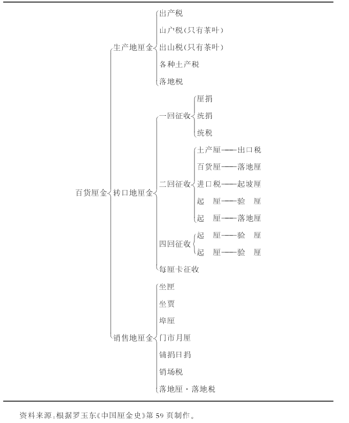 不能说厘金是清末新设的税制。尽管税则的确为新设,但从商税历史性脉络来看,历史上本来就存在牙税、盐引等许可税和专营税,到了清末,只是商税的历史形态及其特征有所改变而已。所以我们可以认为,厘金实则为原来承办制基础上加上了直接课税。同时,过去常关税采取定额制,并没有根据不同产品的不同内容细分课税种类,而厘金税则在精细划分商品种类的基础上,使个别征收成为可能。所以,我们不能认为厘金完全是新税,它是在以往商税和关税的课税经验背景上,以直接课税为根据而作的修正。将这个问题与本书的课题通商口岸市场圈的内容相联系时,可以看到,厘金更贯穿于商品生产、商品流通、商品消费等各个环节,是更加切合流通市场实际情况的课税,而且充分反映了市场内容,这是引人关注之点。