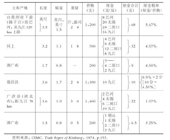 表5-1 九江附近的土布厘金(1874年)