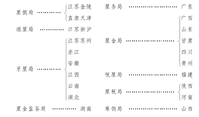 所谓厘金,是以“厘”(商品价格的1%)作为名义上的课税基准而被命名的。各省从19世纪50年代开始同时制定了这一制度,以填补地方财源(当时来讲,是为了对付太平天国起义的临时性资金源)的不足。虽说厘金是在全国共同开始实行的,但每个地区都有各自不同的目的,其征收方法也存在各地差异。这些也反映在各省厘金总局的名称上。各省厘金总局的名称如下所示: