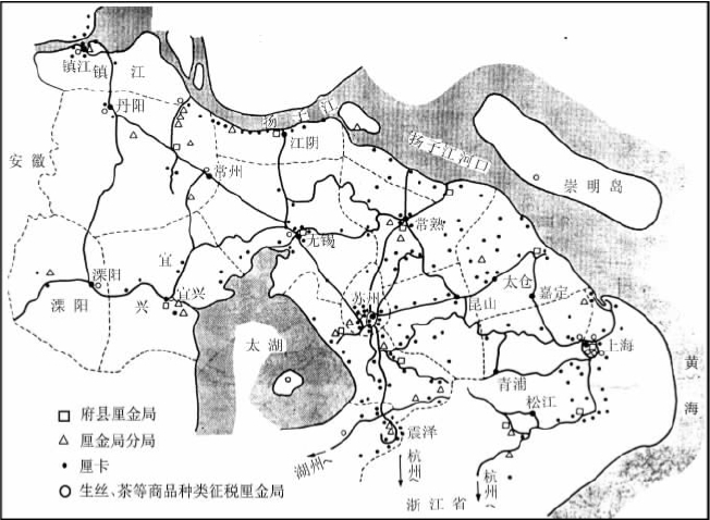 以往的市场研究,其开端殆从定期集市研究始,此言并不为过。其研究方向是寻找出地方末端的流通中心,然后对中心进行确认,进而再确认这些中心的相互分布。但是,这种研究缺乏对商品流通的实际情况进行考察探究的材料,尤其是在市场特点的问题上,基本上都是以消费为中心进行构想。由于中国集镇的记录只显示了这些内容,所以很难进行深入的动态分析。而厘金税却通过对作为课税对象庞大起来的为数众多商品的动向记录,为我们提供了很多以往难以考察的关于个别商品的内容,提供了生产、流通、销售上具有地域特征的、更接近地方市场实际情况的诸多信息与资料。