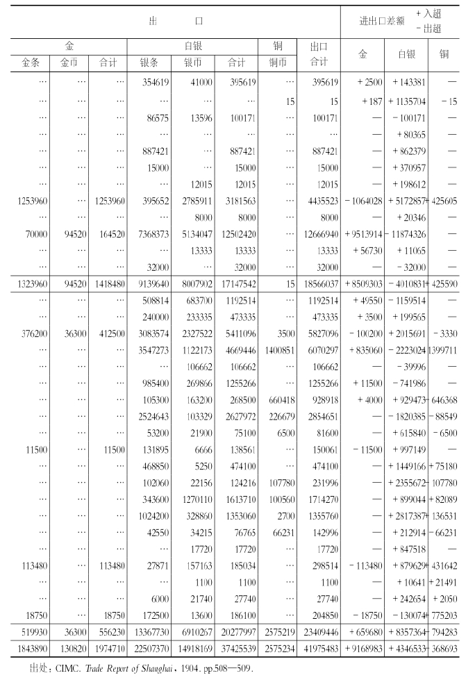 表5-8 国外、国内在上海的金银进出口一览表(1904年)(单位:海关两)