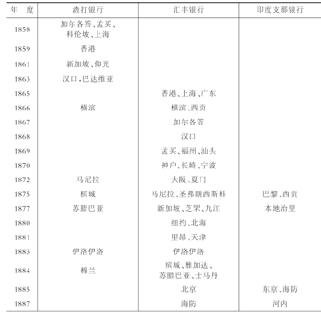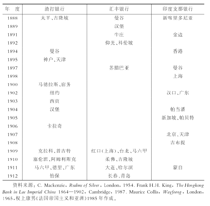 如表5-9所示,外国银行在中国的通商口岸、东南亚的主要贸易都市、欧美的金融中心都设立了总部和分部,不仅拓展国际金融活动,而且也在中国境内的金融活动中扩充自己的网络。