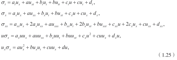 如果出现ut相关的项,就用ut=−uux−uxx,utx=−ux2−uuxx−uxxx等来代替,之后,令独立项的系数为零,可得到对称的系数函数 a(x,t),b(x,t),c(x,t)和d(x,t),这样便得到原方程的对称。随后,便可利用对称来求方程的守恒律。下一节,将介绍对称和守恒律。