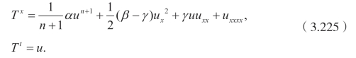 这一小节,利用乘子方法去处理守恒律。首先给出一些基本的定义。如前所述,假定方程可以写成守恒律形式 DxTx+DtTt=0。前面已经得到相应的向量场 X1=∂t和X2=∂x。对于特殊的情况n=2,我们得到额外的标量对称X3=x∂x+5t∂t−2u∂u。对于一般的情况,我们仅有乘子Q=1,即守恒向量