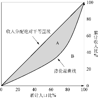 第三种方法,为了研究国民收入在国民之间的分配问题,美国统计学家(或说奥地利统计学家)M·O·洛伦兹在1907年提出了著名的洛伦兹曲线——在一个总体(国家、地区)内,以“最贫穷的人口计算起一直到最富有人口”的人口百分比对应各个人口百分比的收入百分比的点组成的曲线。更具体地说,画一个矩形,矩形的高衡量社会财富的百分比,将之分为五等份,每一等份分为20单位的社会总财富(见图2)。在矩形的长边上,将100单位的家庭从最贫者到最富者自左向右排列,也分为5等份,第一个等份代表收入最低的20单位的家庭。在这个矩形中,将每一等份的家庭所拥有的财富的百分比累计起来,并将相应的点画在图中,便得到了一条曲线,就是洛伦兹曲线。整个洛伦兹曲线是一个正方形,正方形的底边即横轴代表收入获得者在总人口中的百分比,正方形的左边即纵轴显示的是各个百分比人口所获得的收入的百分比。从坐标原点到正方形相应另一个顶点的对角线为均等线,即收入分配绝对平等线。越远离这个线,也就是这个弓拉得越开,收入差距越大。