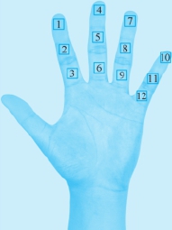 左手“掐指”,可以表示1到12,配合右手的五个手指,就可以表示所有六十进制的数字。不过,两河文明与我国传统的“掐指”方法是不一样的,它们都是用拇指“掐”(指点)其余四个手指的特定部分,但所“掐”的位置有所不同,具体情形如下: