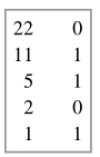 我们随便写下一个数字,比如说:22。将这个数除以2,把结果写在它的下面。然后,再除以2。11除以2得到5以及余数1,我们将余数写在11的右边,而在11下面写下整数部分5。按照这个算法继续进行下去,直至最终得到1。整个过程如右图所示。