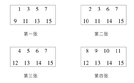 第一张卡片中是1到15之间所有除以2余1的数,即二进制表示为“×××1”的数,而其第一个数是0001。相似地,第二张卡片中是1到15之间所有二进制表示为“××1×”的数,而其第一个数是0010。后两张依此类推。