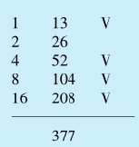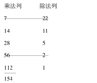 这位军官验算了许多例子,发现通过这个乘法系列总能得到正确的结果。他感到很惊奇,因为他不明白这究竟是什么数学道理。事实上,如果我们将乘法列余下的数值提出公因子7,我们就会发现剩下的数字依次是2、4、16。而回想我们刚刚得到22的二进制表示等于10110,事情一下子就清楚了:牧师最后所做的加法确实相当于计算了7×22=154。