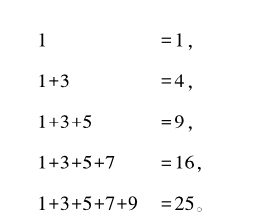 在上式中如果取n=mp,则我们发现,m2p——一个任意自然数的偶数次方——恰好等于所有从1到2mp-1之间的奇数之和。例如取m=3,p=2,则有