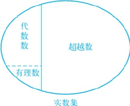 数学中有“实数”的概念,粗略地说它对应着数轴上的点。实数中除了代数数还有别的数存在,这些并非代数数的实数称为“超越数”。我们用一个图来表示这些概念的关系: