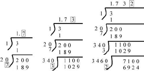 从以上两个步骤,我们已经发现了计算ak步骤的规律性,即:作除法,在余数后面继续添两个0,然后,以除数(2×10kxk-1+ak)和商ak来试算ak。为了更加形象,我们来看看计算3的前几步,注意每一步的被除数、除数和商数的算法: