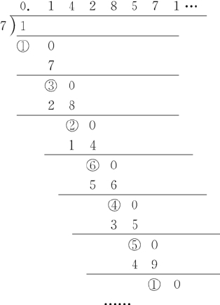 以上“答数”中紧接在小数点后的1说明10包含一个7。而余数是那个带圈的3,因此接下来是以7除30。这时,商是4而余数是那带圈的2,如此等等。这里,余数是问题的关键:在除以7的运算中,不是零的余数只能有6种。因此,在最多做六次除以7之后,就不可能再有新的余数出现,因而此前出现过的余数必然重复出现。在1再一次成为余数时,上述除法过程就会开始重复。所以,1/7的小数表示出现6位数字的循环的形式。