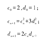 的速度比上面介绍的{xn}要快得多得多!此外,数对(cn,dn)同样满足丢番图方程x2-3y2=1,集合{(cn,dn) |n=0,1,2,…}事实上是{(an,bn) |n=0,1,2,…}的一个真子集。