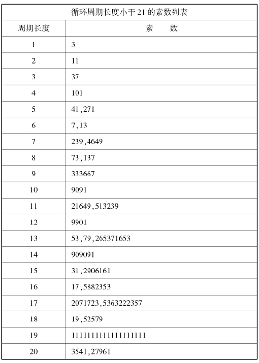 即恰由k个1构成的数。因此,两个问题是相同的:如果我们知道所有素数的循环周期,则我们至少已经部分地解决了(a)和(b)。