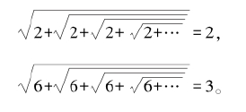 讨论完连续一串1构成的数之后,我们来考察一种连续一串根号的表达式,即无穷的、看起来有些奇怪的根式迭代式: