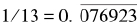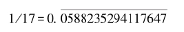 3是一个素数,它的循环周期最长可以为2,但1/3 = 0. 33333…,其循环周期长度只是1。13也是素数,因此1/13的循环周期最长可以达到12位数字,但1/13的除法做到6步时同样的余数就已经“绕”回来了,因而它的循环节也就开始了:。那么,7是不是其倒数的循环周期达到最大长度的唯一整数?答案是否定的,下一个“全循环”素数是17: