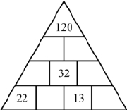 右边这个金字塔形状的图案有四层,从上到下每层依次有1、2、3、4个格子。它的每个格子里原来都有一个数字,底层之外的每一层中,每个格子里的数字都等于它下方两个格子里的数字之和。现在,图案里有些数字不见了,聪明的你能把它们找回来吗?