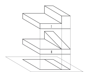 如图2-7所示,将两个物体向投影面作正投影,所得到的投影完全相同。如果单纯由这个投影图来想象物体的话,既可想象为物体Ⅰ,也可想象为物体Ⅱ,还可以想象为其他物体。这说明什么呢?说明仅有物体的一个投影不能确定物体的形状。这是因为物体有长、宽、高3个方向的尺寸,而一个投影仅反映两个向度,对于上图投影,就只反映长和宽,而不反映物体的高度。由此可见,仅凭物体的一个投影不能确切、完整地表达物体的形状。而在工程设计时,使用的投影图必须能够确切地表达物体的形状,为此,必须采用增加投影面的数量得到一组投影图,来完全确定物体的形状。