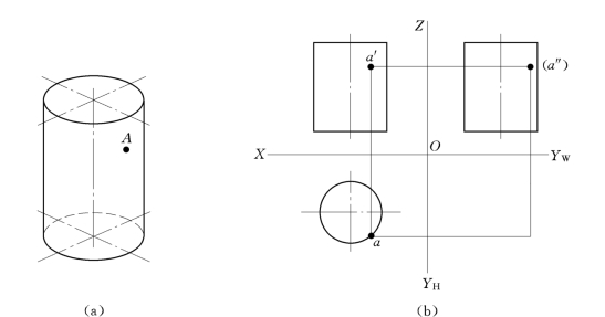 如果已知点A的正面投影a′,求其他两投影时,可利用圆柱面的积聚投影,先过a′作OX轴的垂线,与水平投影下半个圆周交于a,即为点A的水平投影,再利用已知点的两个投影求出点A的侧面投影a″。