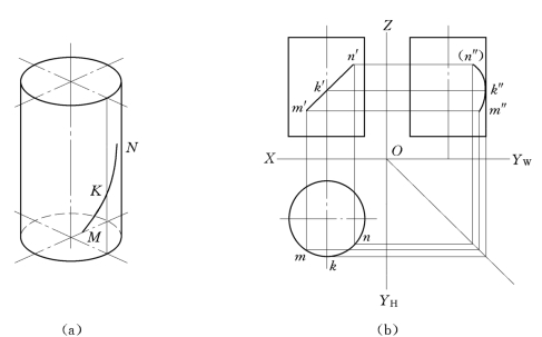 如果已知线段MKN的正面投影或侧面投影,求其他两投影时,可先在线段的已知投影上定出若干点,求出各点的其他投影,再依次光滑地连接其同面投影,并判别其可见性,即为所求。