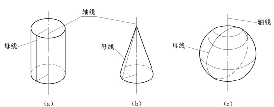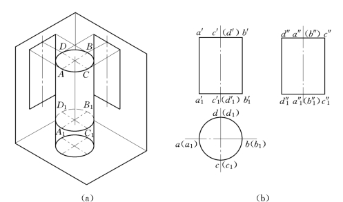 圆柱体由圆柱面和上、下底平面所围成,如图3-11(a)所示。图3-11(b)为一轴线垂直于水平投影面的正圆柱体的三面投影图。其中上、下两底平面为水平面,它的水平投影仍为圆,正面投影和侧面投影均积聚为直线;圆柱体轴线垂直于水平投影面,圆柱面的水平投影有积聚性,在正立投影面上画出轮廓素线AA 1和BB 1的投影;在侧立投影面上画出轮廓素线CC 1和DD 1的投影。应注意的是,轮廓素线AA 1和BB 1的侧面投影及CC 1和DD 1的正面投影与轴线的投影重合均不必画出。同时,应在投影图中用点画线画出圆柱体轴线的投影和圆的中心线。