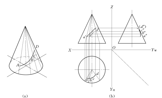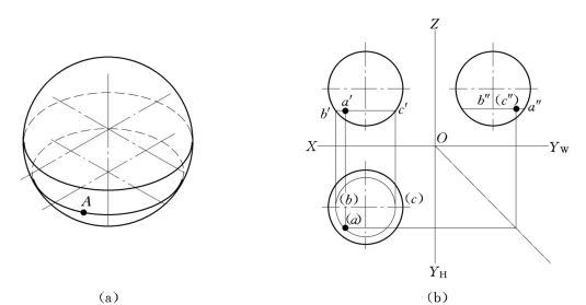 如果已知点A的正面投影a′,要求其他两投影时,可以通过作辅助圆的方法进行作图。在正面投影上过a′作平行于OX轴的直线,交球的轮廓素线于b′、c′。b′c′即为过点A且平行于H面的辅助圆的积聚投影,其长度等于辅助圆直径。以b′c′为直径在水平投影中作球体投影的同心圆,即为辅助圆的水平投影。再过a′作X轴的垂线,交辅助圆的水平投影于a,即为过点A的水平投影。最后根据a、a′求得a″。求球体表面上线段的投影,可以用上述方法先求出线段上若干点的投影,注意转折点的投影,再依次光滑地连接各点的同面投影,并判别可见性,即为所求。