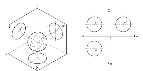 侧面投影是看得见的左半球面和看不见的右半球面投影的重合,与其对应的水平投影和正面投影是铅垂中心线左边的半个圆和右边的半个圆。侧面投影的圆周是球面上平行于W面最大的投影,与其对应的水平投影和正面投影分别与别的铅垂中心线重合,仍然用点画线表示。
