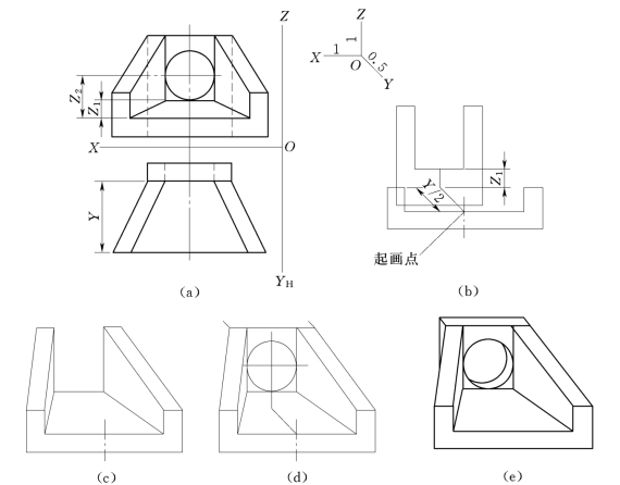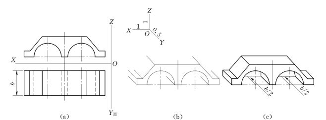 (1)Y轴的轴向伸缩系数为0.5,因此宽度方向尺寸要缩短一半。